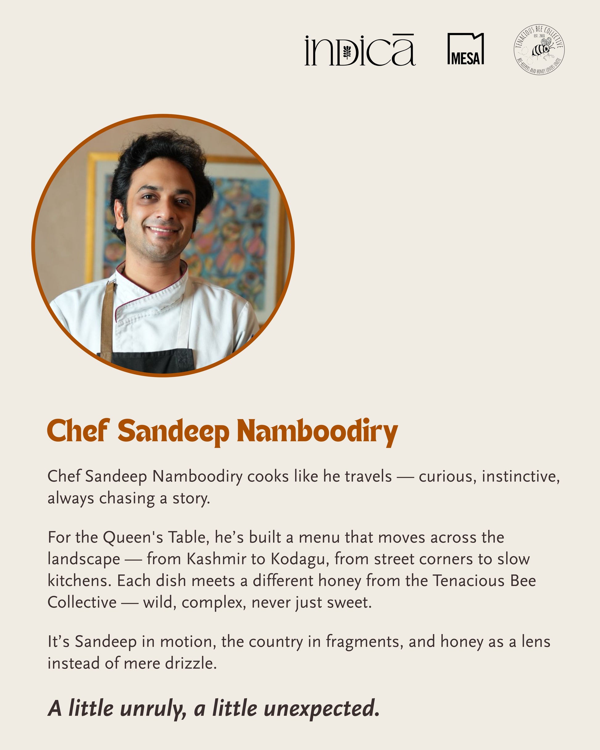 This tasting traces Chef Sandeep Namboodiry’s culinary curiosity: from the way honey ferments and ages to the way it shapes texture on a plate. The menu moves from crisp, bright chaat to the coast and the mountains — each course threaded with wild, indigenous honey in unexpected forms.
