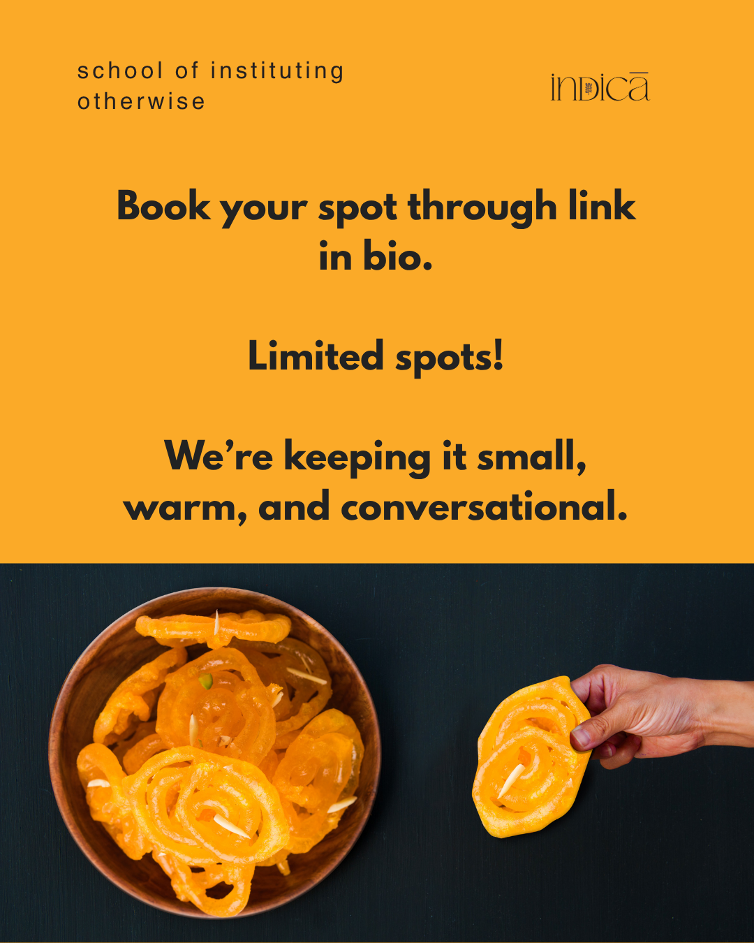 The Kitchen is a Story We Tell is a one-day workshop on food, memory, and storytelling with Meenakshi Thirukode, founder of School of Instituting Otherwise. It is an invitation to think about food as an archive of care, culture, and connection.